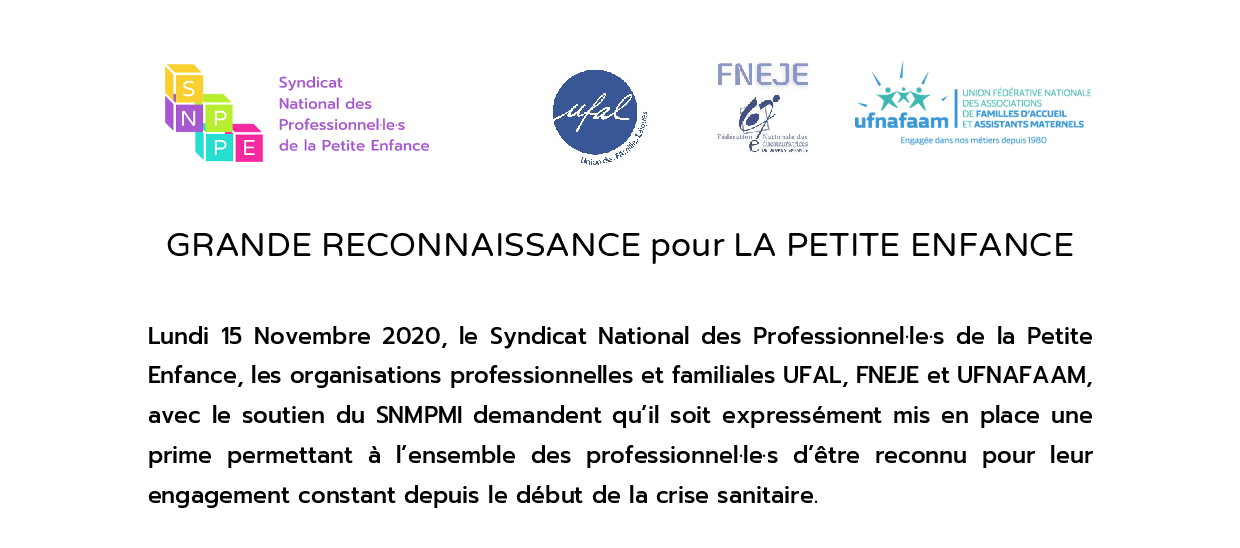 Le Syndicat National des Professionnel·le·s de la Petite Enfance, les organisations professionnelles et familiales UFAL, FNEJE et UFNAFAAM, avec le soutien du SNMPMI demandent qu’il soit expressément mis en place une prime permettant à l’ensemble des professionnel·le·s d’être reconnu pour leur engagement constant depuis le début de la crise sanitaire.