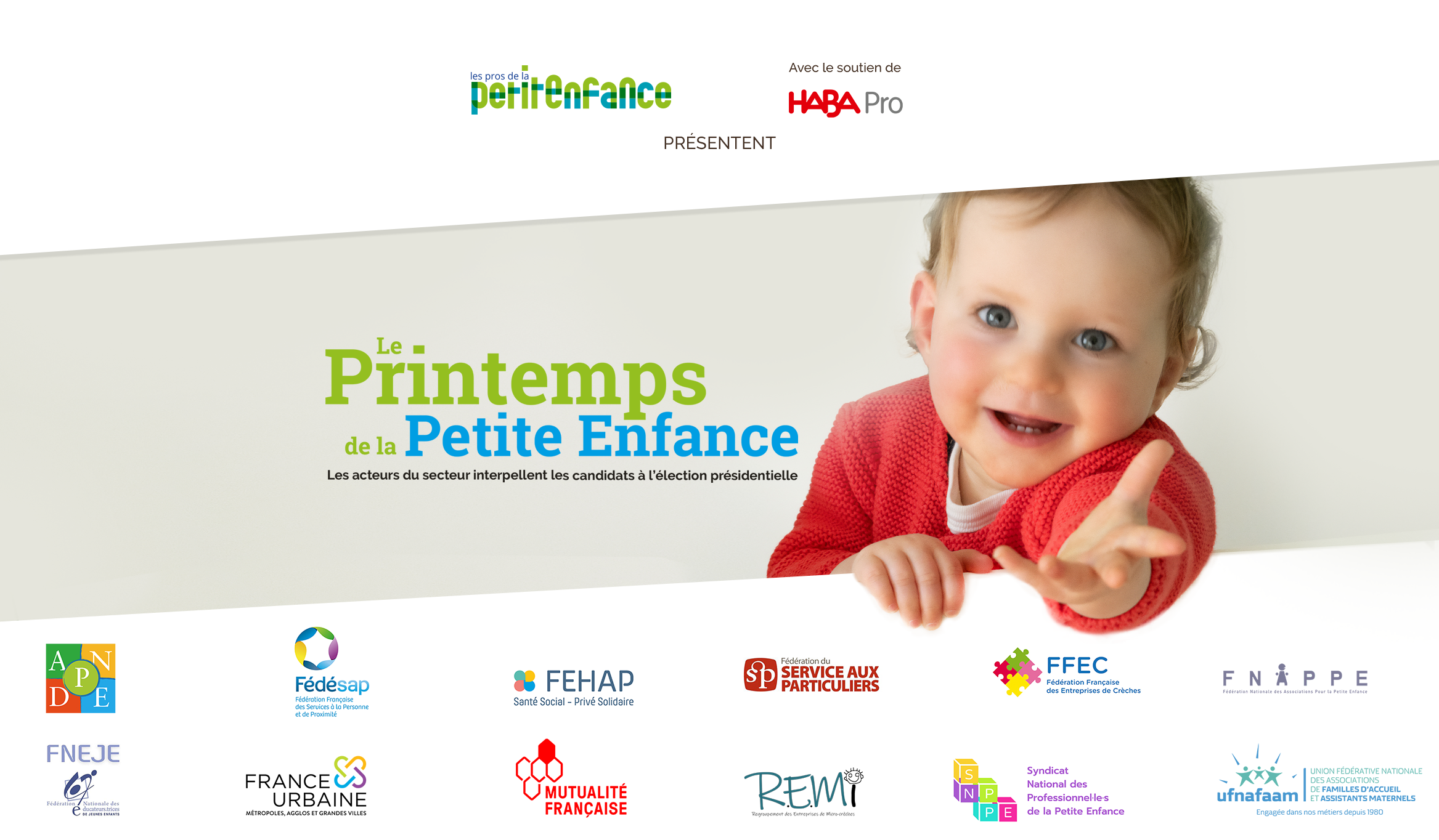 Nous, représentants des modes d’accueil individuel comme collectif, publics comme privés, associatifs comme marchands, et les représentants des 600 000 professionnels de la Petite Enfance, assistants maternels, professionnels d’entreprises de garde d’enfants à domicile et professionnels de crèches, co-organisons avec le site Les Pros de la Petite Enfance le Printemps de la Petite Enfance le 21 mars prochain à Paris pour faire de la Petite Enfance une réelle priorité des politiques publiques à venir.