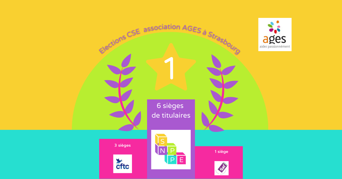 Le Syndicat National des Professionnel·le·s de la Petite Enfance devient le 1er syndicat aux élections CSE de AGES à Strasbourg (Association de Gestion des Équipements Sociaux) avec un siège dans le collège des cadres et 5 sièges dans le collège des employés (+1 siège de suppléant). Le Bureau National félicite les professionnel·les qui ont représenté les couleurs du syndicat dans ces élections.